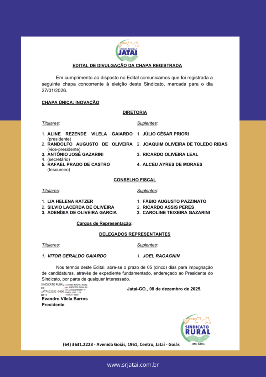Em cumprimento ao disposto no Edital comunicamos que foi registrada a seguinte chapa concorrente à eleição deste Sindicato, marcada para o dia 27/01/2026.